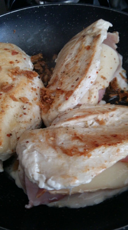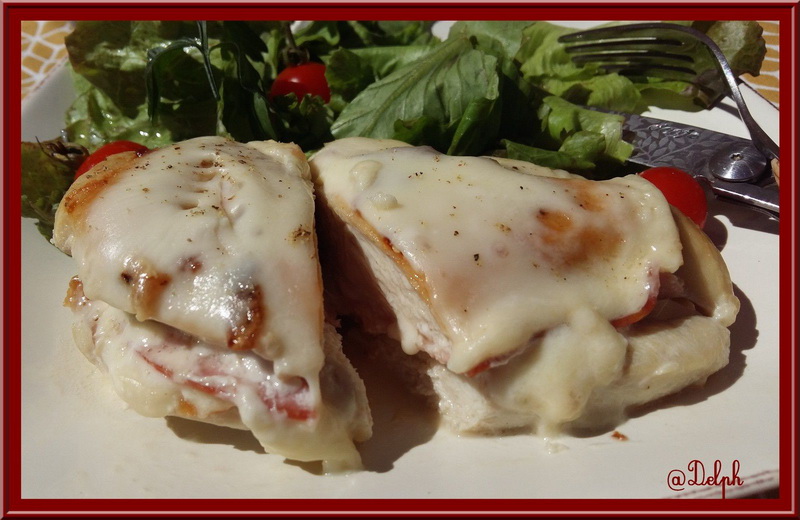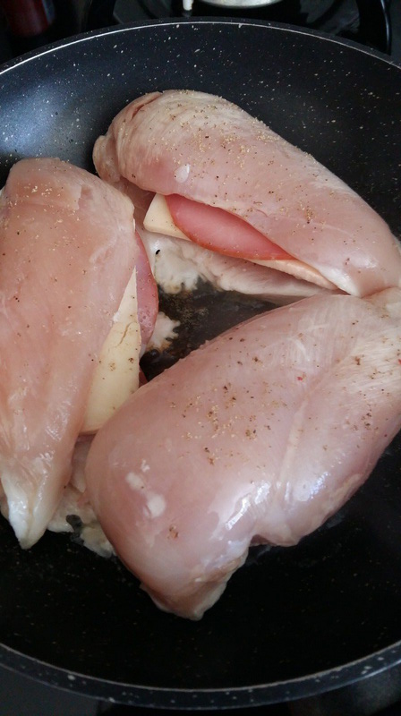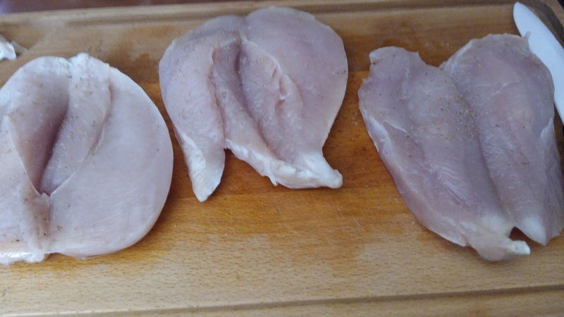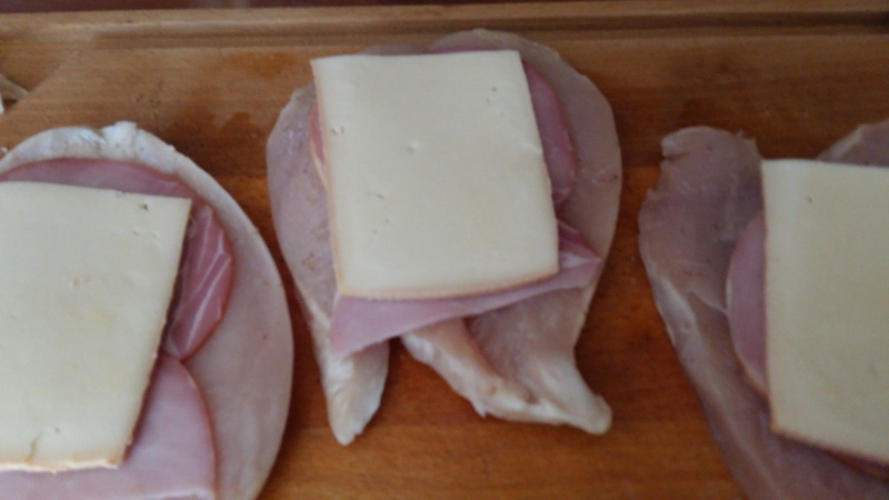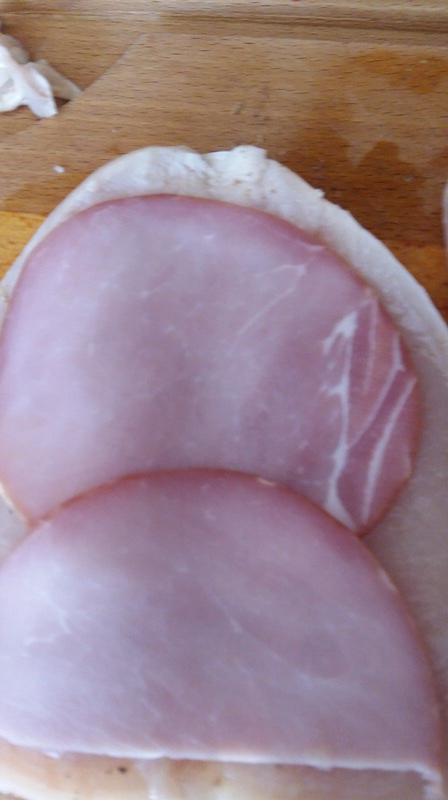 - Couper en 2 dans l’épaisseur vos escalopes de dinde, les ouvrir, puis mettre 2 tranches de bacon et une tranche de raclette, saler, poivre, et mettre de l’ail en poudre, les refermer, bien appuyer dessus, pour qu’elles soient le plus plates possible.