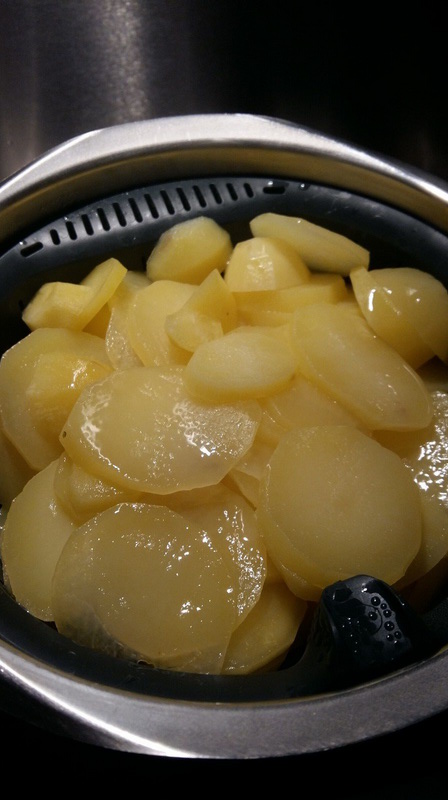 - Éplucher, laver et couper en lamelles es pommes de terre, les mettre dans le panier cuisson, mettre l’eau et le bouillon cube dans le bol, insérer le panier cuisson et programmer 25min/Varoma/Vit1.. A la sonnerie, enlever le panier cuisson, égoutter et réserver. Vider et rincer le bol.