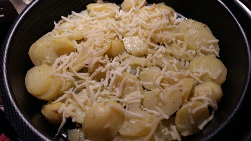- Éplucher, laver et couper les pommes de terre en lamelles, éplucher l’oignon le couper en lamelles. Faire cuire les pommes de terre environ 10-15 minutes dans de l’eau bouillante avec un bouillon cube.