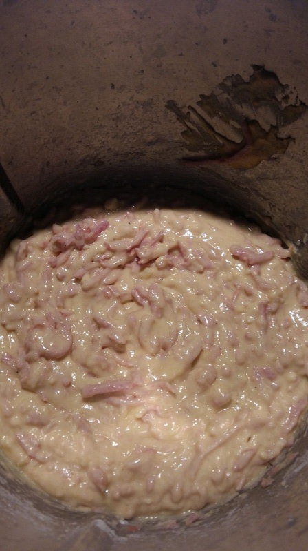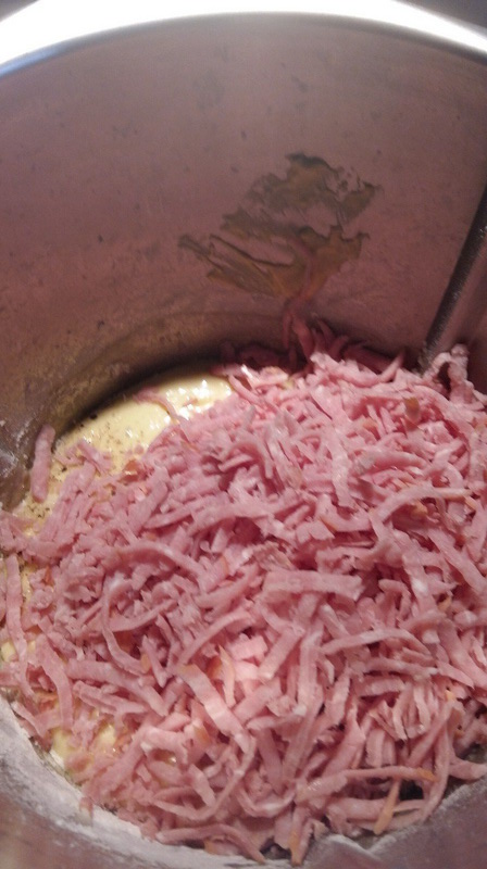 - Ajouter le râpé de jambon, la moutarde, saler poivrer puis mélanger 30sec/couteau inversé/ vit 3.
