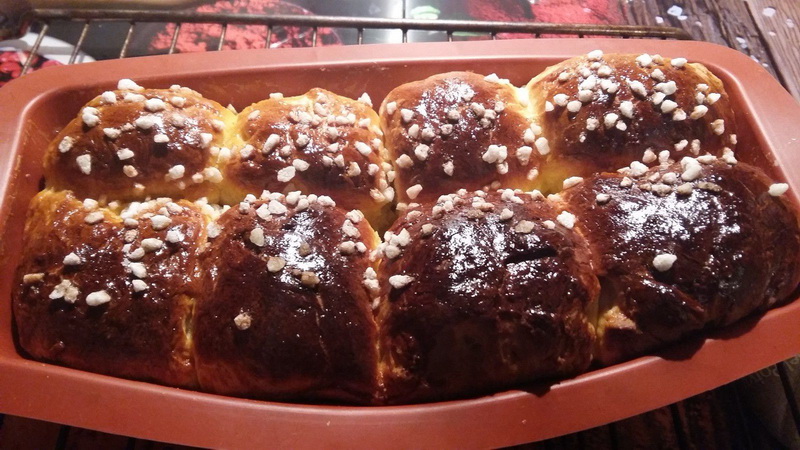 - Badigeonner de jaune d’œuf une fois, dès que le four atteint la température, badigeonner une deuxième fois et saupoudrer de sucre en grains.