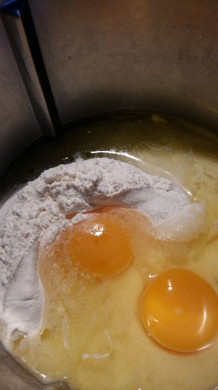 - Dans la cuve verser la farine, le sel et commencer a ajouter le lait concentré et les œufs ensuite la levure émiettée.