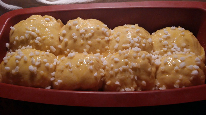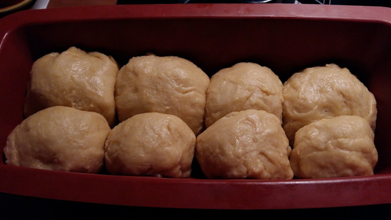 - Rompre la pâton et le diviser en 8 parts égales, que vous disposez dans un moule à cake chemisé de papier sulfurisé. Couvrir et laisser pousser encore une fois jusqu’à ce qu’elle double de volume.