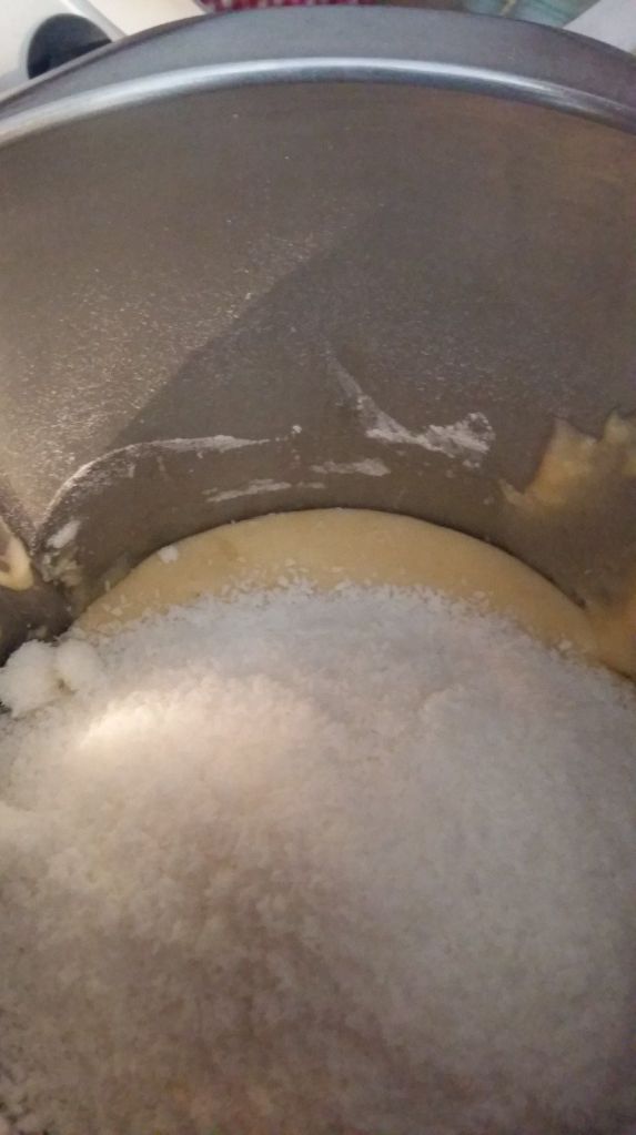- Ajouter tout le reste des ingrédients sauf la noix de coco et mélanger 40sec/Vit4. Ajouter la noix de coco râpée et mélanger 30sec/couteau inversé/Vit3.