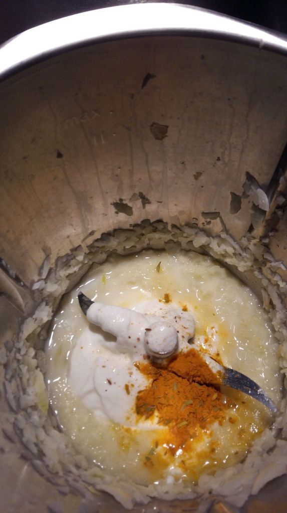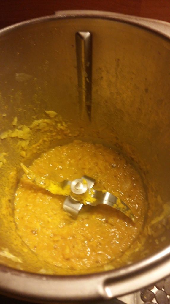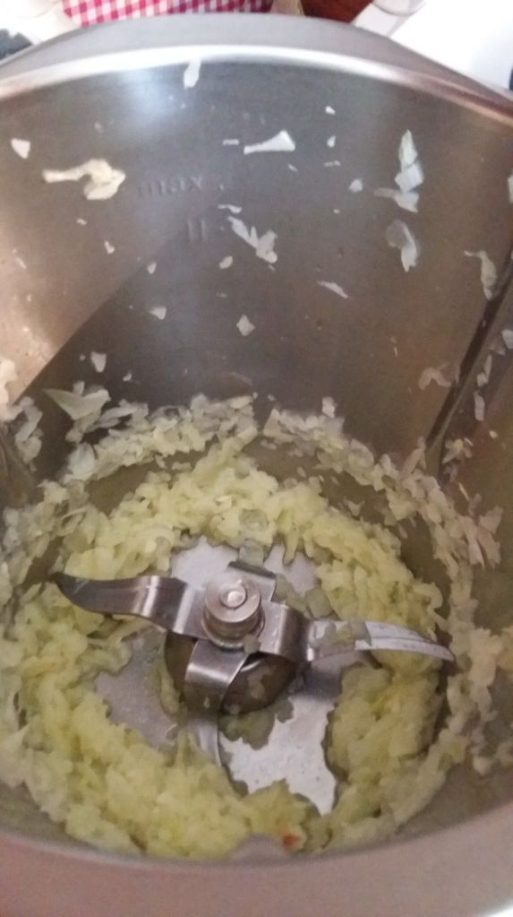 - Peler l’ail et les oignons, les mettre dans le bol du Thermomix, mixer 5sec/vit5, ajouter l’huile et faire revenir 3min/100°C/vit2.
