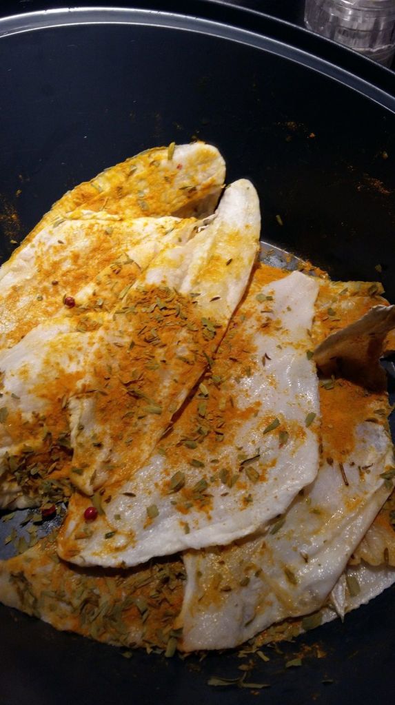 - Pendant ce temps préparer vos filets de poisson dans le panier Varoma, saupoudrer d’un peu de curry mais pas trop et quelques baies roses, saler.