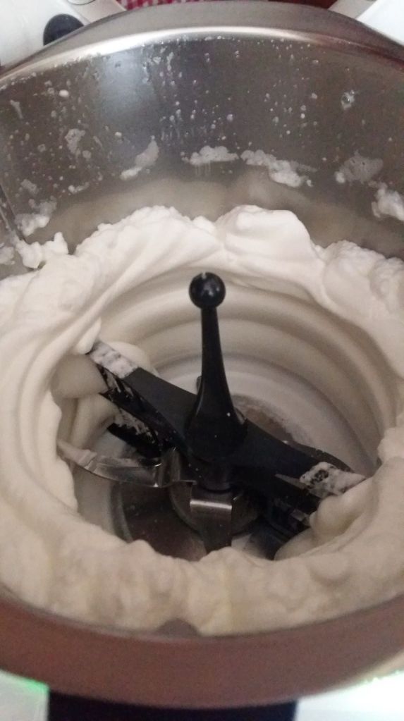 - A la sonnerie, insérer le fouet puis mettre les blancs en neige réservé et mélanger 1min/Vit1 (cela peine un peu au départ mais c’est normal).