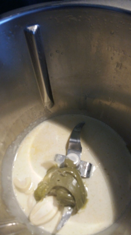 - Mettre la crème et le beurre puis faire chauffer 3 min30/100°C/Vit1, ajouter le chocolat et la pâte de pistache puis mélanger 30sec/Vit4.