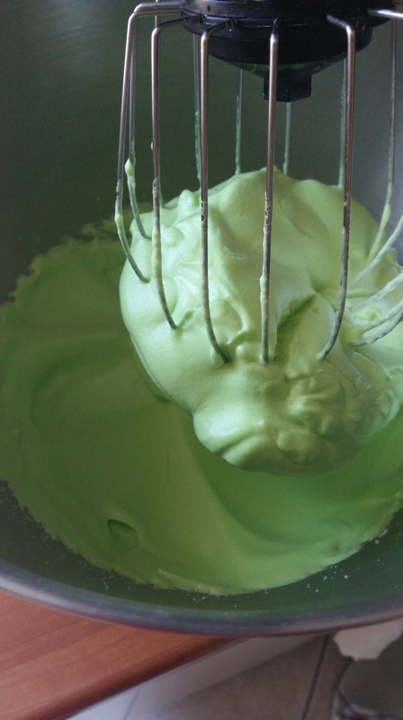 - Monter les blancs en neige avec une cuillère à soupe de sucre en poudre puis avec le reste de sucre en fouettant à vitesse maximale. Intégrer votre colorant en poudre.(une pointe de couteau).
