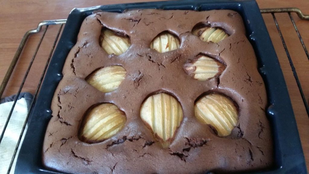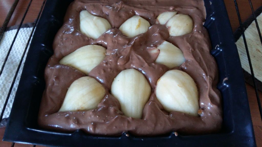 - Disposer les poires coupées en lamelles sur la pâte chocolatée