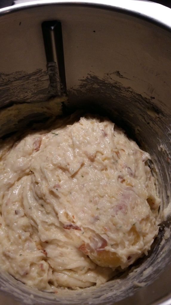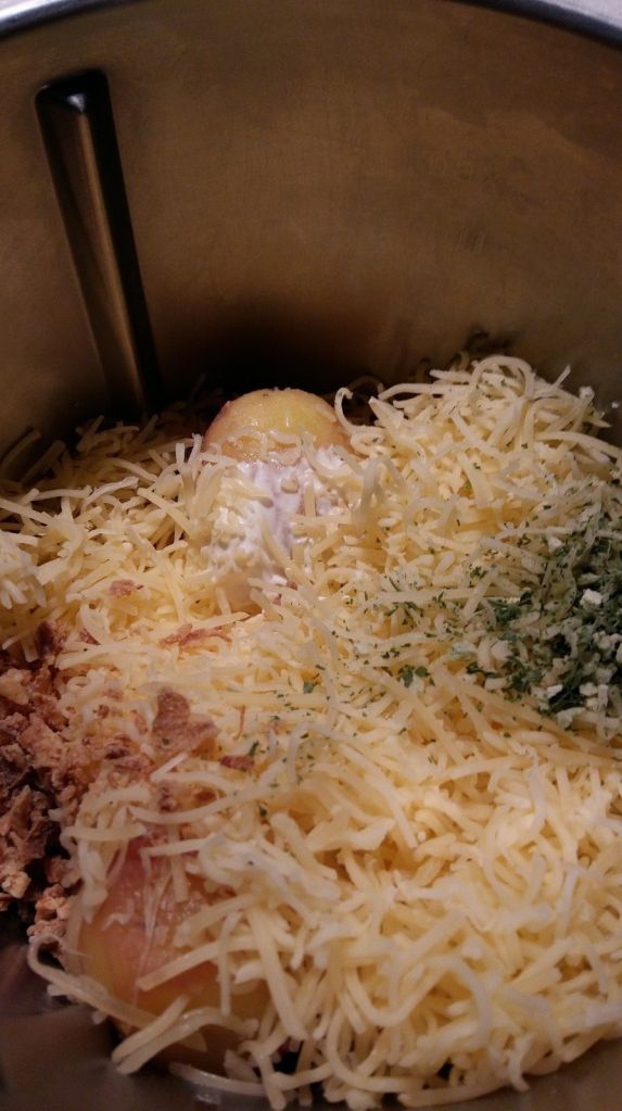 - Les éplucher et les mettre dans le bol du Thermomix avec la crème fraîche, le comté râpé, la persillade et l’oignon en poudre, poivrer mixer 20sec/Vit4. Vous obtenez une purée.