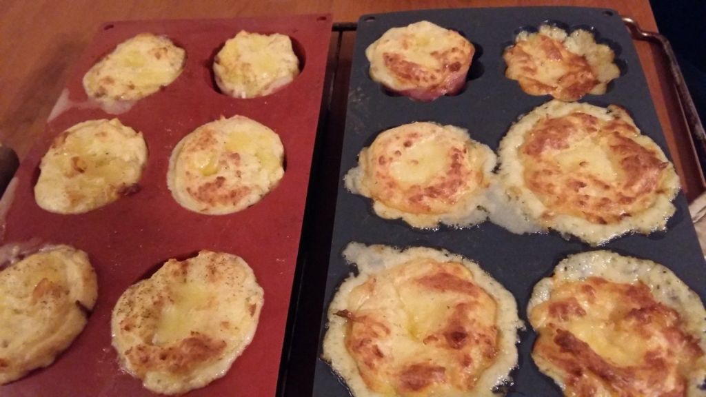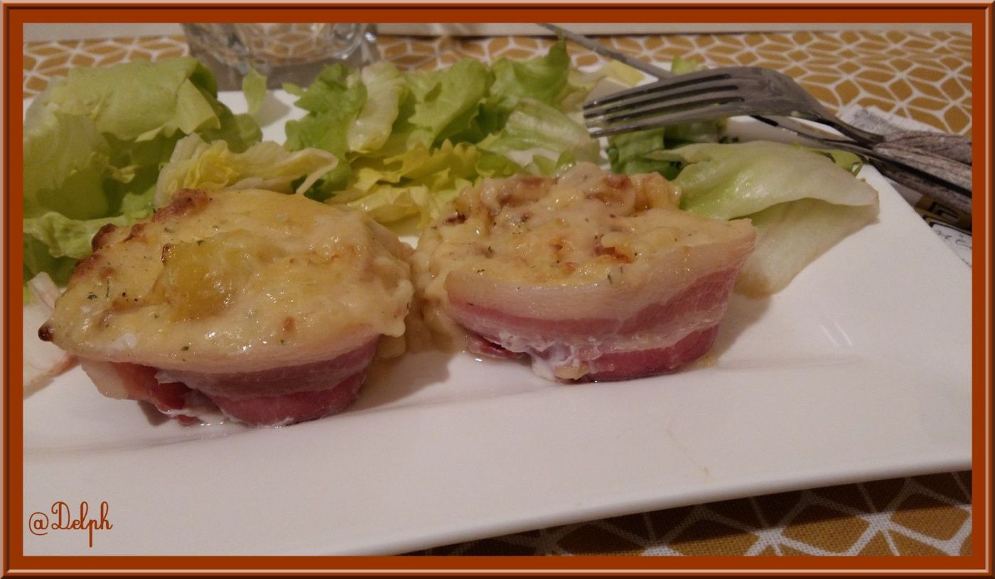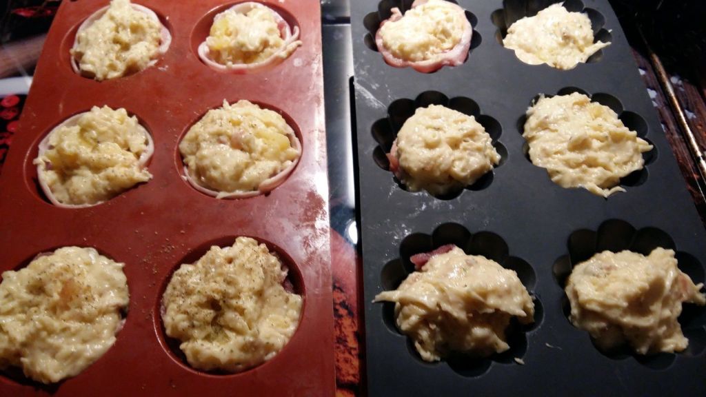 - Mettre vos tranches de lard dans un moule à muffins en silicone puis remplir chaque empreinte avec la purée de pomme de terre.