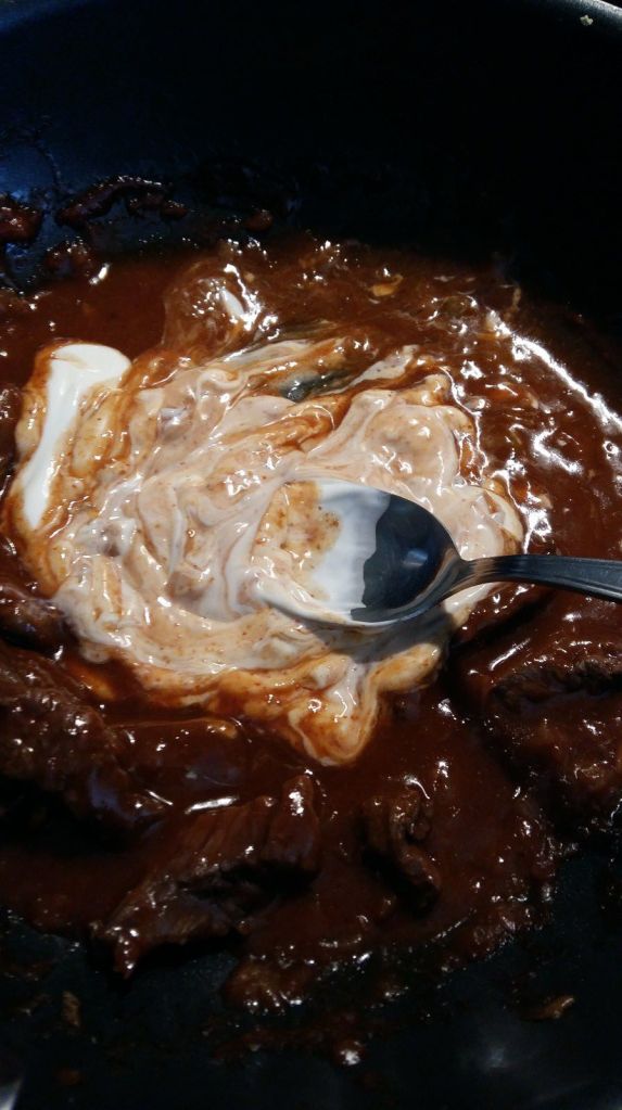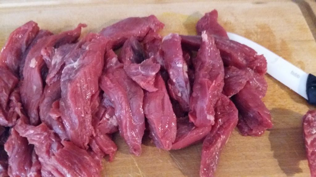 - Pendant ce temps, découper vos bavettes de bœuf en fines lanières, les ajouter aux oignons, et les faire revenir sur feu vif, bien mélanger.