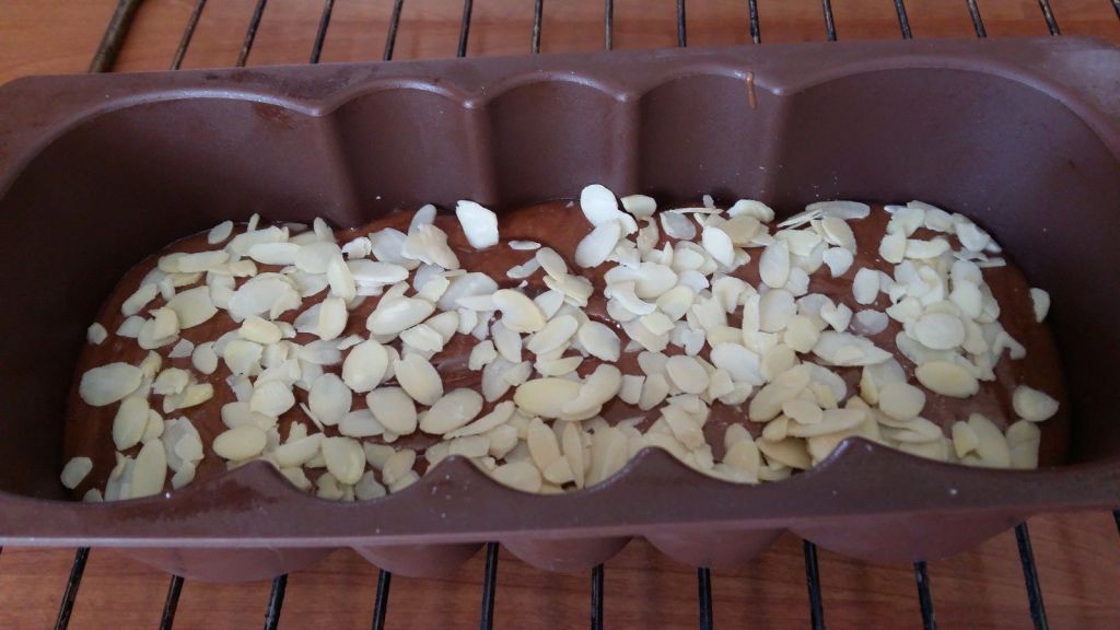 - Verser la préparation dans un moule à cake puis parsemer d’amandes effilées..