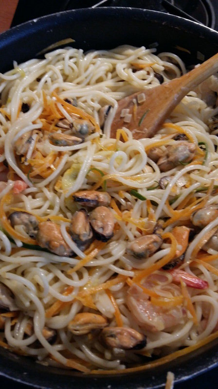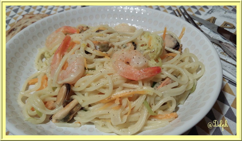 Encore une recette dénichée chez notre généreuse Sophie, du blog « La tendresse en Cuisine » mes hommes se sont régalés, merci Sophie pour ce plat bien savoureux. J’ai ajouté quelques crevettes. (Désolée mes photos ne sont pas belles, mais j’ai eu un problème de luminosité.)