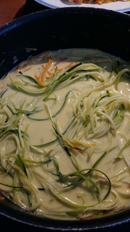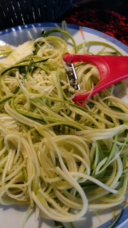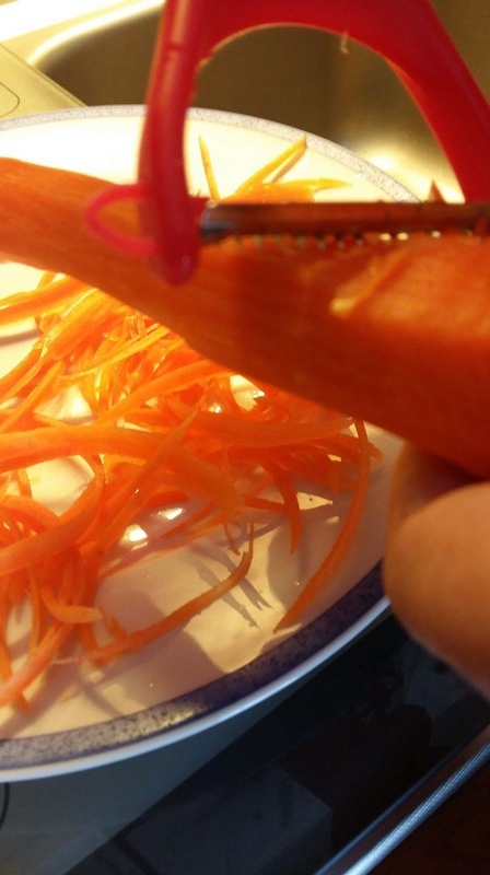 5. Pendant ce temps laver la courgette, peler la carotte et les passer dans le « taille légumes » afin d’en faire des spaghetti de légumes .