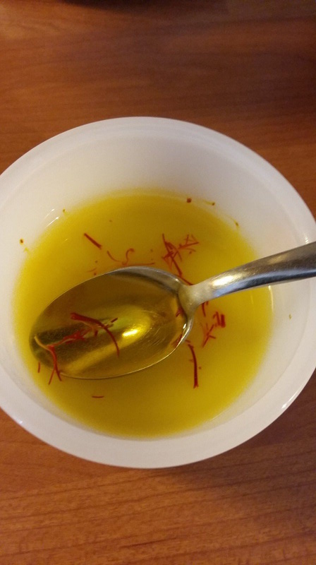 1. Une demi heure avant de cuisiner préparer l’infusion de safran. Prélever trois pincées de safran en filaments et le réduire en poudre avec les doigts.