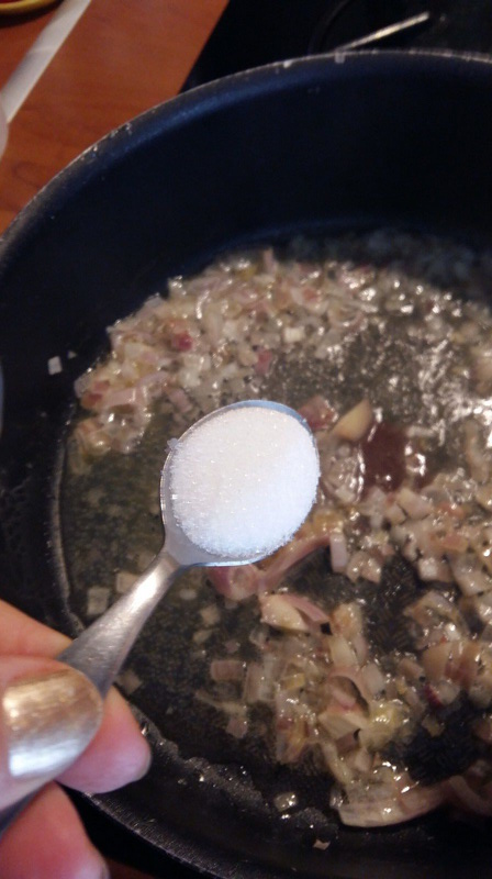 6. Ajouter une cuillère à café rase de sucre en poudre dans la poêle afin de casser l’acidité du vin blanc.