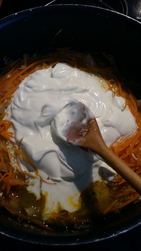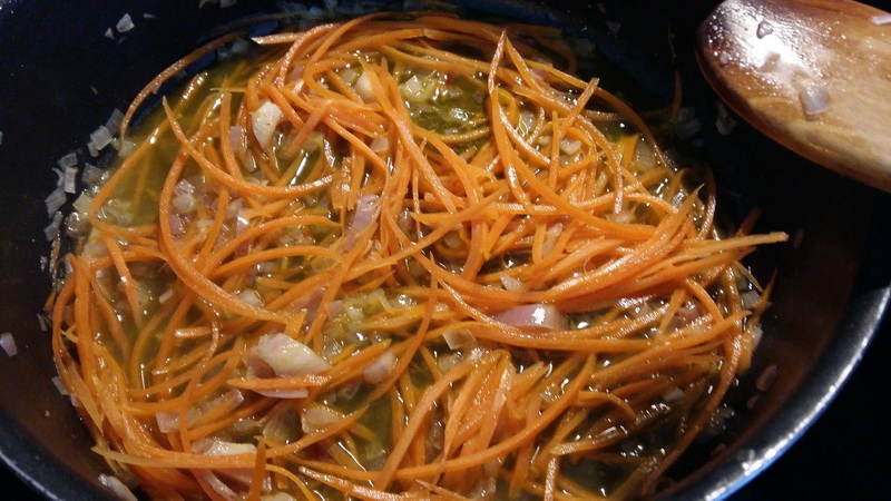7. Quand la sauce a réduit de la moitié ajouter les spaghetti de carotte dans la poêle.