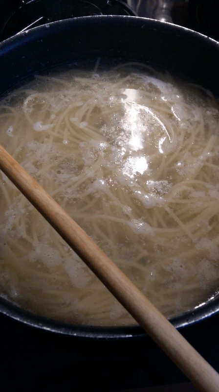 10. Faire bouillir une grosse marmite d’eau salée et dès qu’elle bout y verser les pâtes et laisser cuire le temps indiqué sur le paquet pour des pâtes « al dente ».