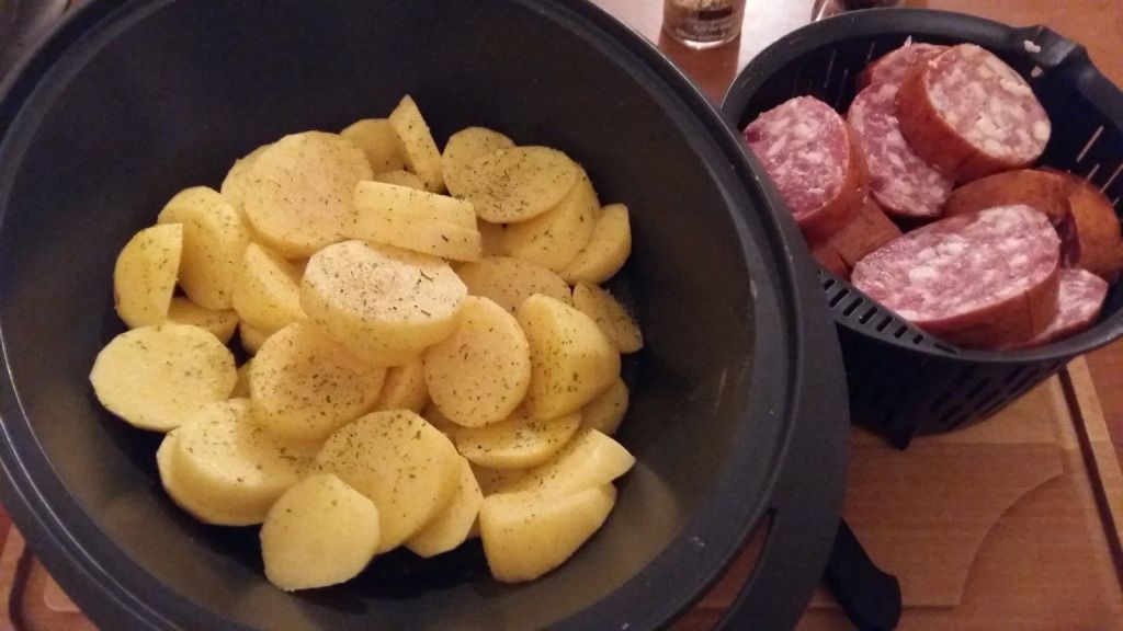 - A la sonnerie, enlever le panier cuisson à l’aide de la spatule puis mettre les saucisses sur les pommes de terre.