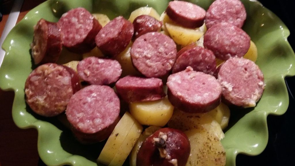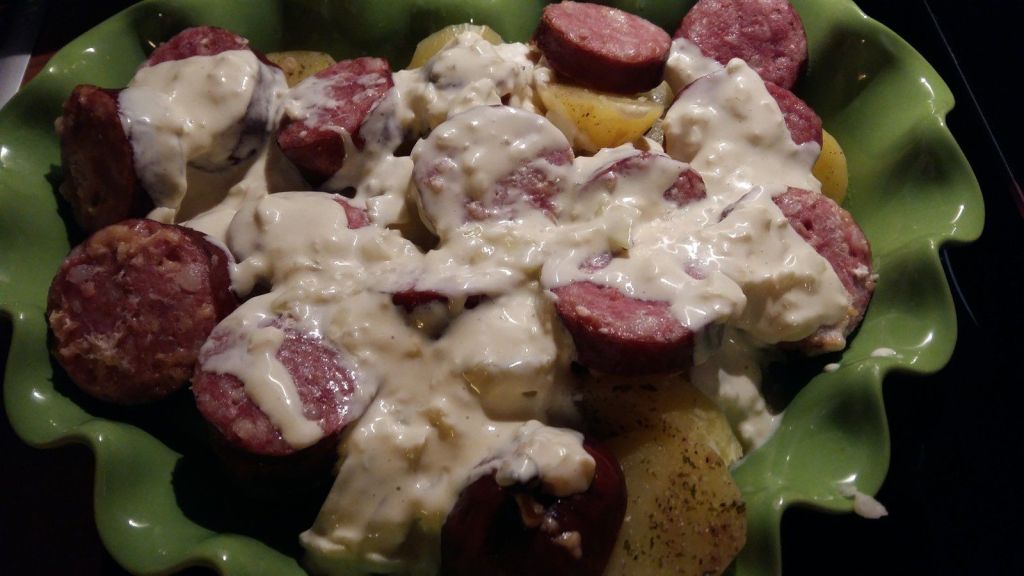 - Couper les saucisses en rondelles, les disposer dans un plat à gratin avec les pommes de terre, puis napper avec votre préparation à base de crème fraîche.