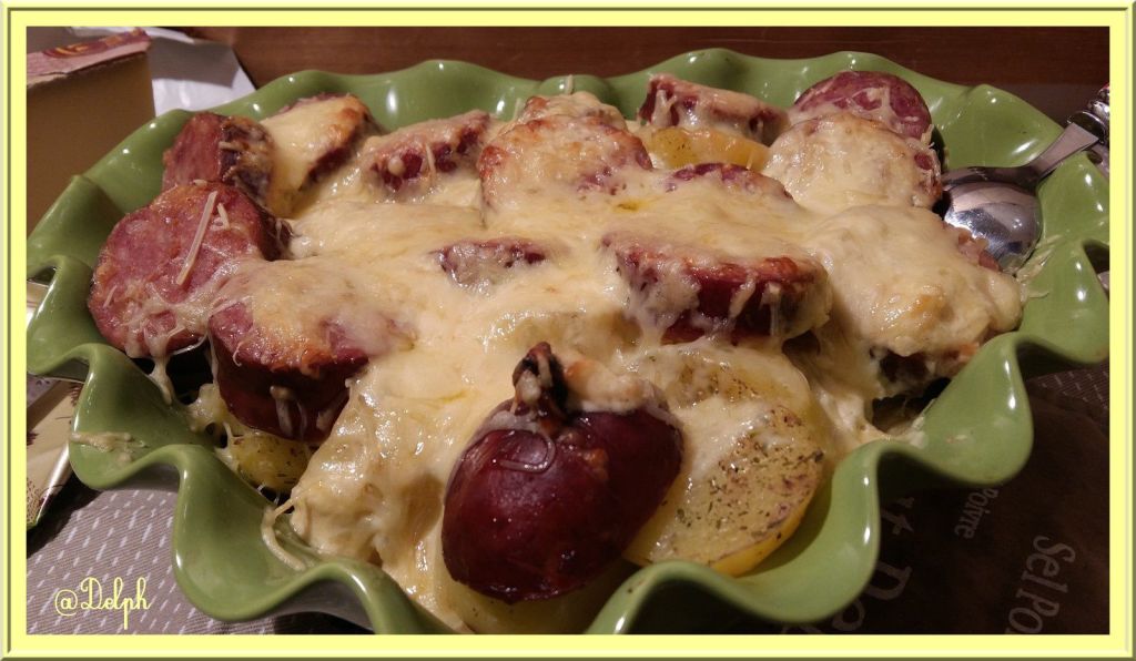Nous avons la chance d’avoir de la famille, dans le jura et à chacune de leurs visites, ils nous apportent du Comté et des Saucisses…Hum cela sent bon dans leurs valises….Et pour faire plaisir à mes hommes j’ai réalisé ce petit gratin.