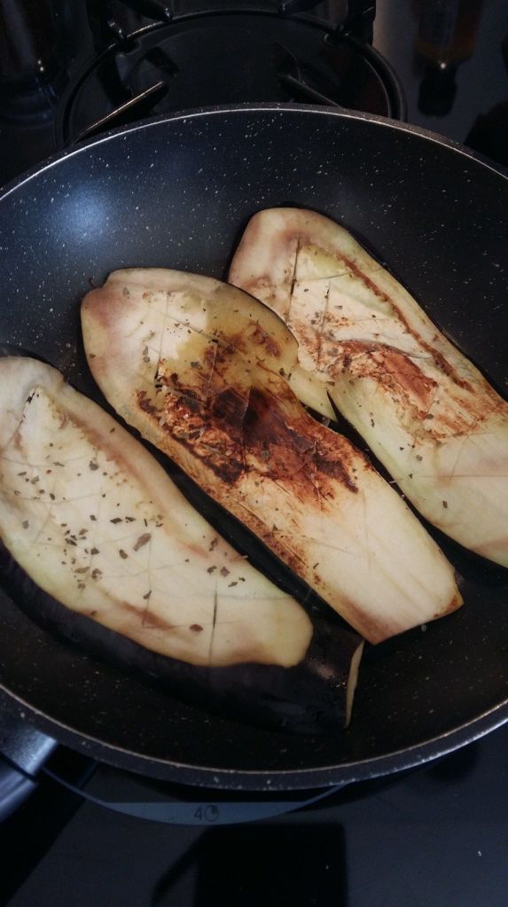 - Couper l’aubergine en 4 tranches dans le sens de la longueur, les faire dorer dans une cuillère à café d’huile.