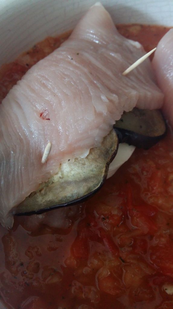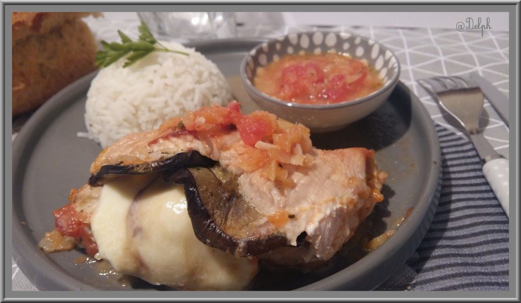 - Sur chaque escalope, déposer 1 tranche d’aubergine, un peu de mozzarella, et du romarin séché.