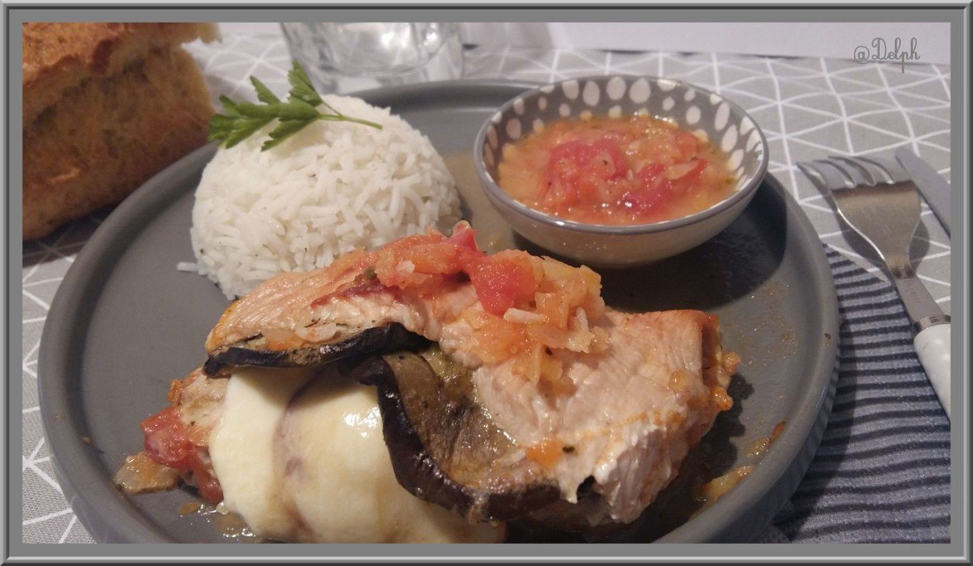 - Sur chaque escalope, déposer 1 tranche d’aubergine, un peu de mozzarella, et du romarin séché.