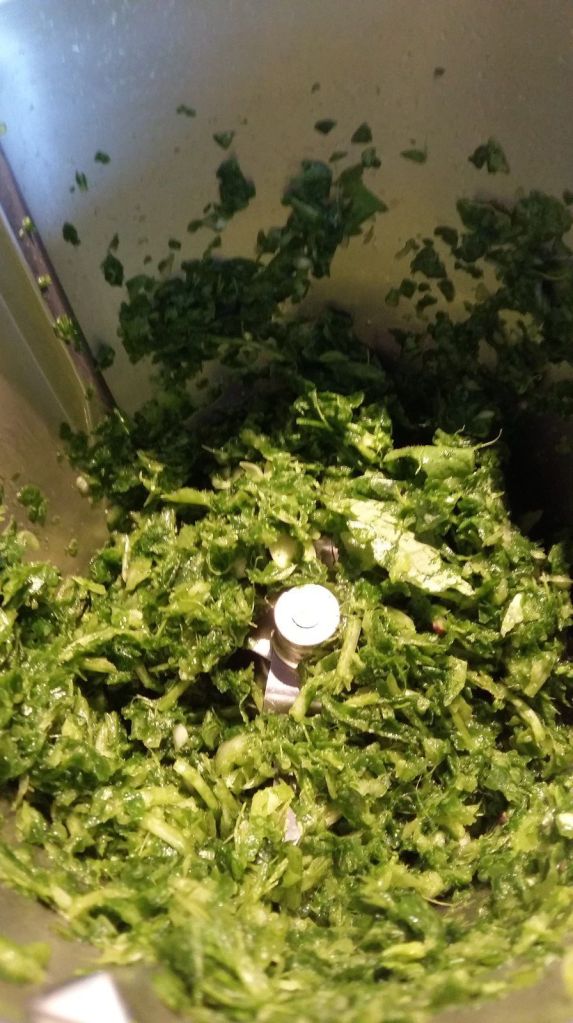 - Laver les fanes et les essorer, éplucher les oignons et les couper en deux, tout mettre dans le bol et mixer 10sec/vit5, ouvrir puis racler les bords et mixer à nouveau 5 sec/Vit5.