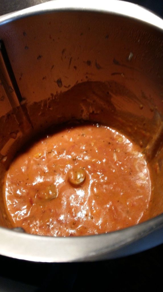- Préparer la sauce, éplucher vos gousses d’ail et l’oignon les mettre dans le bol du Thermomix, mixer 5sec/Vit 5, ajouter l’huile d’olive et faire revenir 1 min/90°C/Vit mijotage, ajouter les tomates concassées puis faire revenir 5min/80°C/vit mijotage, à la sonnerie, assaisonner puis ajouter la crème et le vin puis mélanger 40sec/vit2.