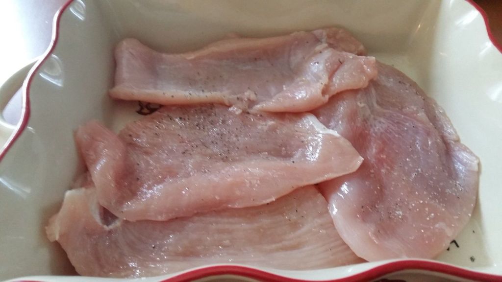 - Frotter votre plat à gratin avec une gousse d’ail, puis verser un peu d’huile d’olive, disposer les escalopes salées et poivrées.