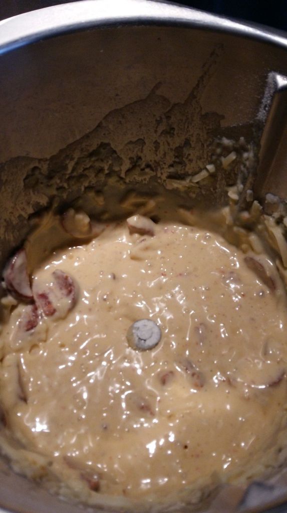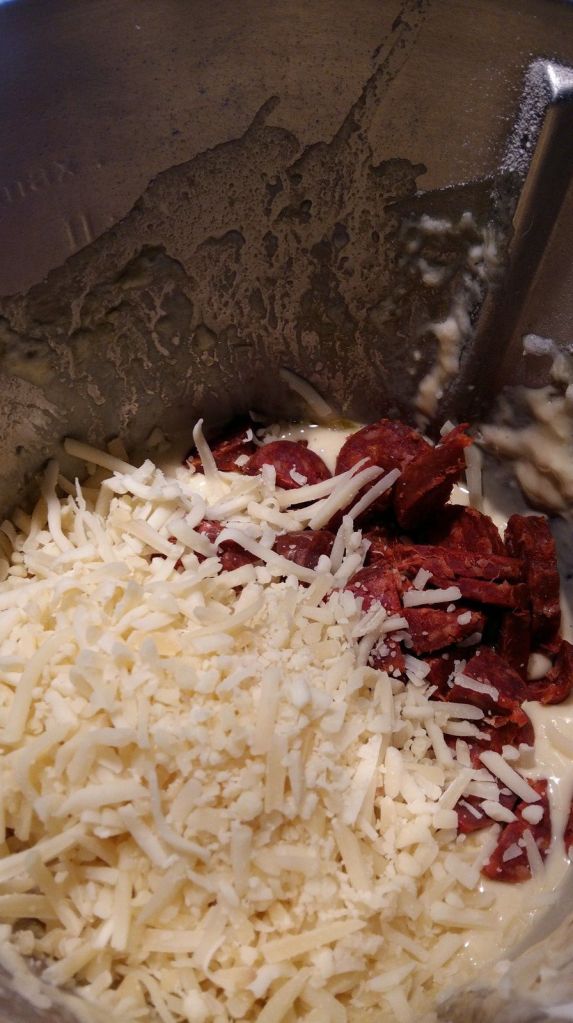 - Couper le chorizo en petits morceaux et l’incorporer à la pâte avec le Comté râpé puis mélanger 30sec/Couteau inversé/Vit3.