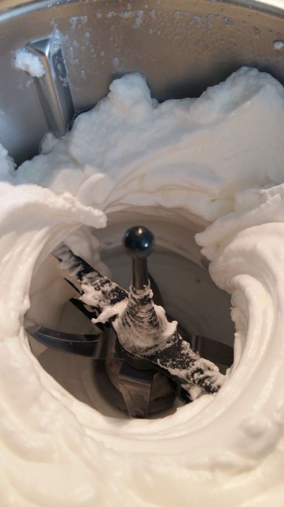 - Séparer les blancs des jaunes d’oeufs, réserver les jaunes et mettre les blancs dans le bol avec une pincée de sel, donner deux coups de turbo, insérer le fouet puis programmer 4 min/Vit3,5 sans le gobelet. Réserver vos blancs, inutile de rincer le bol, laisser le fouet pour le reste de la recette.
