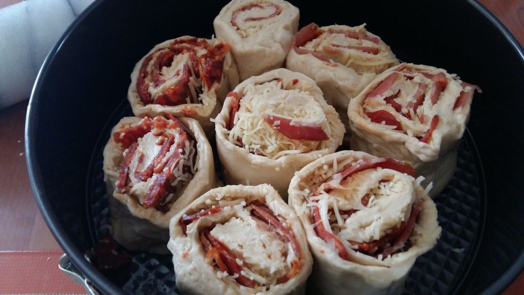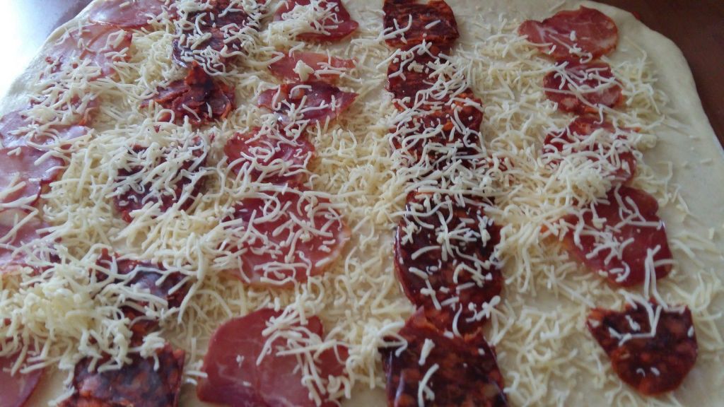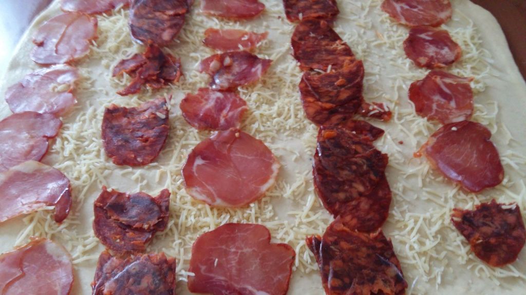 - Étaler la pâte à l’aide d’un rouleau à pâtisserie, parsemer de Comté râpé puis la garnir avec les tranches fines de lomo et de chorizo, recouvrir de Comté râpé .