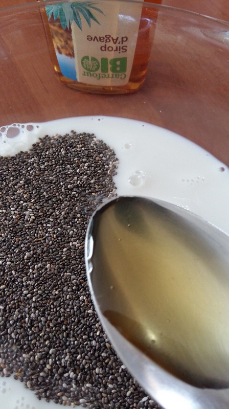 1. Verser le lait d’amande dans un grand récipient. Ajouter les graines de Chia, le sirop d’agave et l’arôme d’amande amère. Mélanger trois fois à 5 min d’intervalle pour bien répartir les graines et éviter qu’elles forment un bloc.