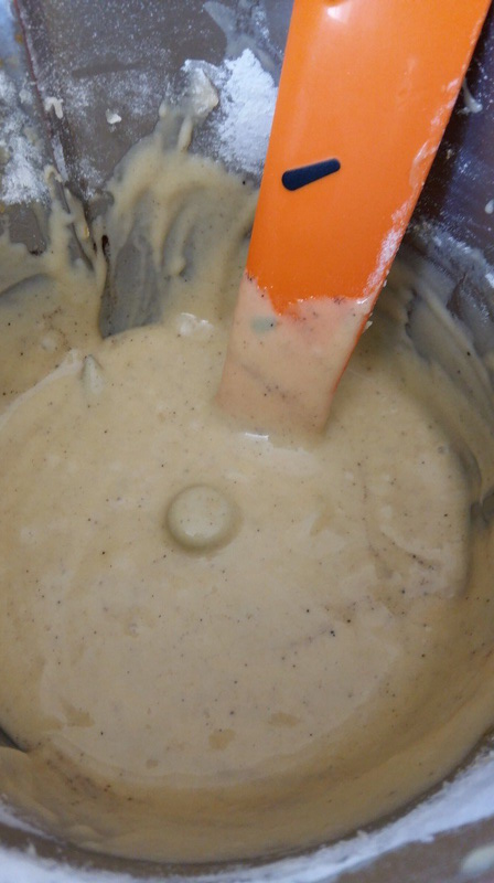 3. A la sonnerie, enlever le fouet, puis mettre l’huile, la crème fraîche, la farine, la levure et la vanille et mixer 2min/Vit4.