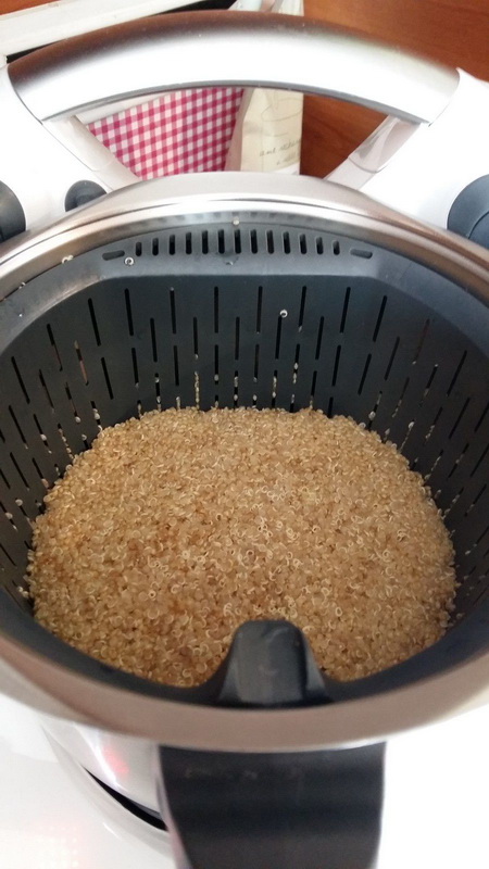 - Mettre l’eau et 1 c à c de sel dans le bol. Insérer le panier cuisson, y mettre le quinoa et mélanger à l’aide de la spatule pour humidifier tous les grains, puis cuire, 20min/Varoma/Vit1 enlever le gobelet les 10 dernières minutes. A la sonnerie retirer le panier cuisson à l’aide de la spatule, transvaser le quinoa dans un grand saladier et laisser refroidir. Vider le bol du liquide, inutile de le rincer.