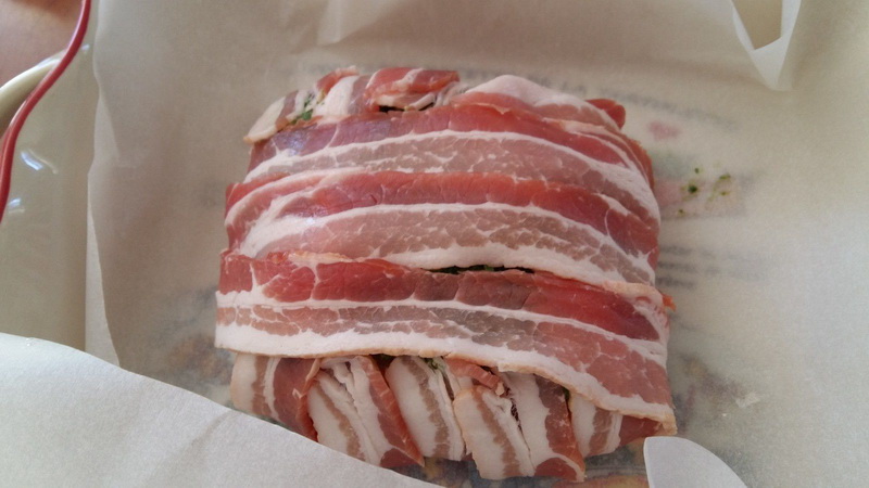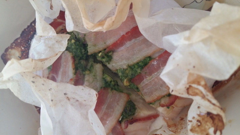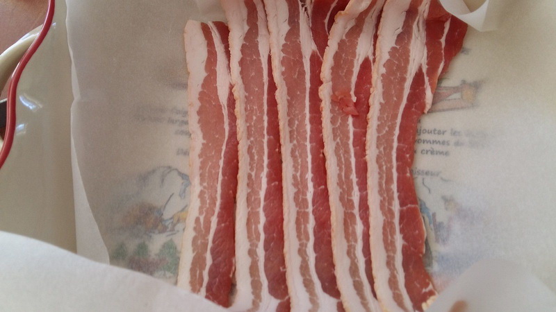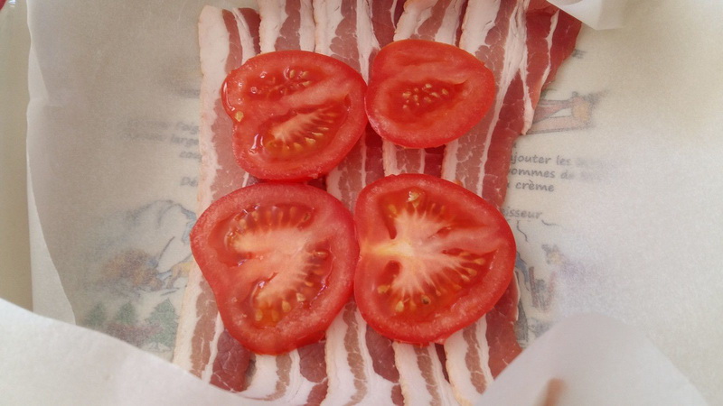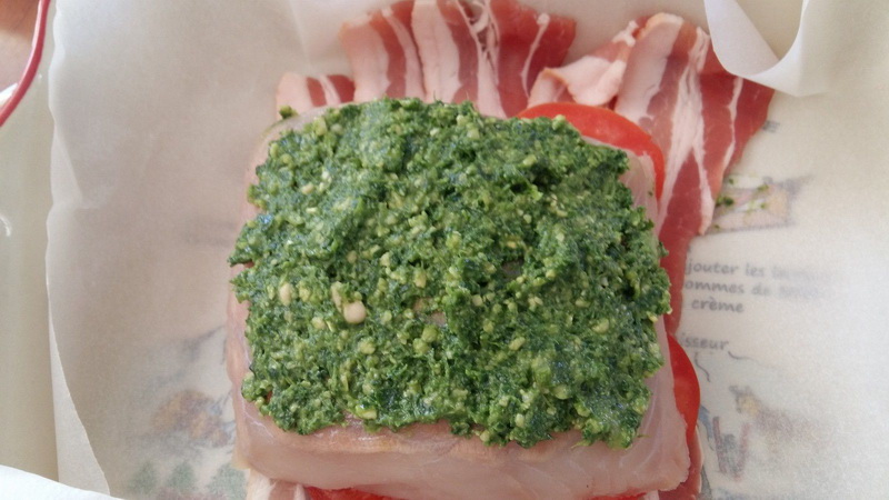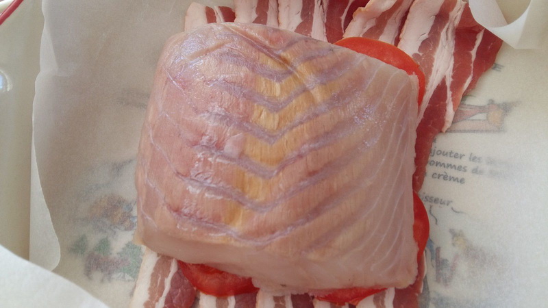 - Déposer une feuille de papier cuisson au fond d’un plat à gratin puis mettre les tranches de lard, les faire se superposer, déposer 4 tranches fines de tomates, puis mettre par dessus le poisson, et recouvrir de deux cuillères à soupe de peso, poivrer, inutile de saler, le lard l’est assez.