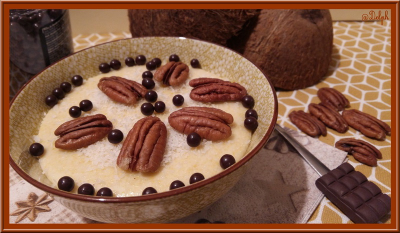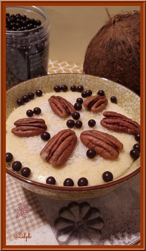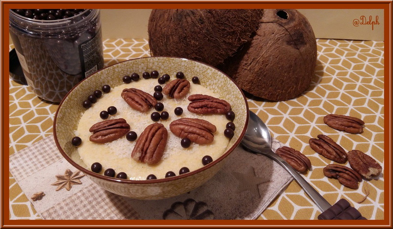 5. Au moment de servir, saupoudrer de coco râpé, disposer quelques noix de Pécan et ajouter des perles croquantes. Servir chaud, tiède ou froid.