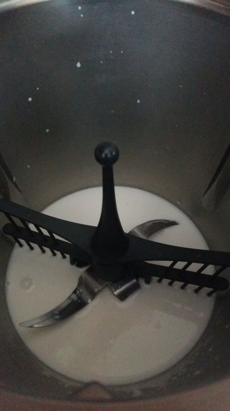 2. Insérer le fouet dans le bol puis verser le lait de coco dans le bol avec la vanille et le sucre porter à frémissement  2 min/100°C/ Vit1.
