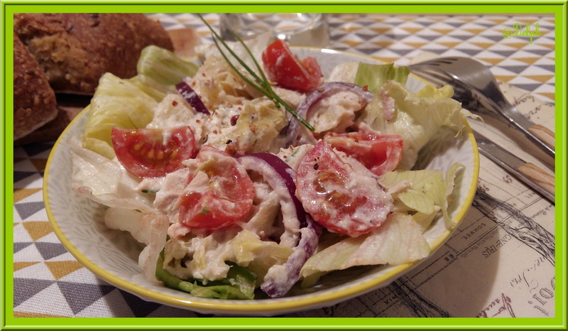 Au moment de servir, verser la sauce et mélanger, disposer quelques feuilles de salade vertes puis servir votre salade dessus. A déguster bien frais.