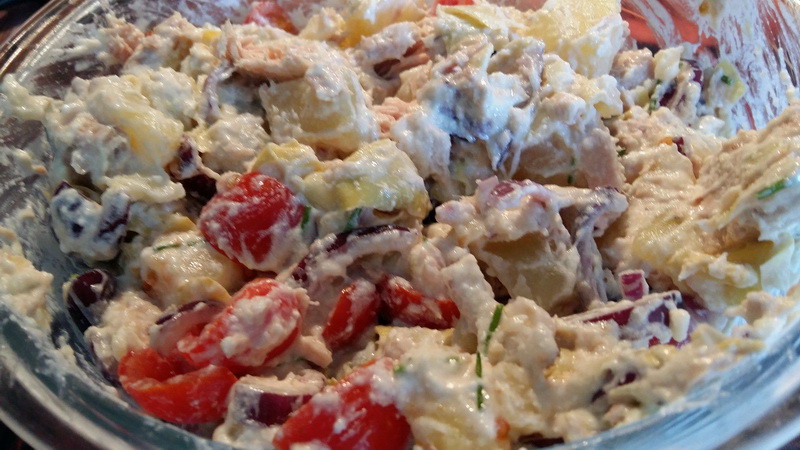Nous aimons beaucoup les salades de pomme de terre, j’ai voulu changer de la traditionnelle salade en faisant une sauce à  base de brandade de morue, c’est frais et léger, nous nous sommes régalés.