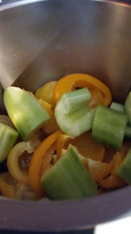 - Mettre tous les légumes dans le bol du Thermomix avec le pain coupé en morceaux, le sel, le poivre, le vinaigre, l’huile d’olive et mixer pendant 2 min de la vitesse 5 à la vitesse 10.