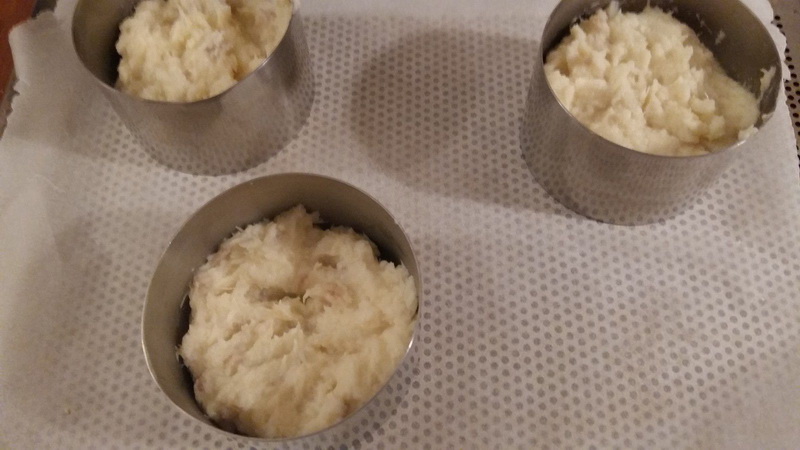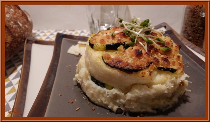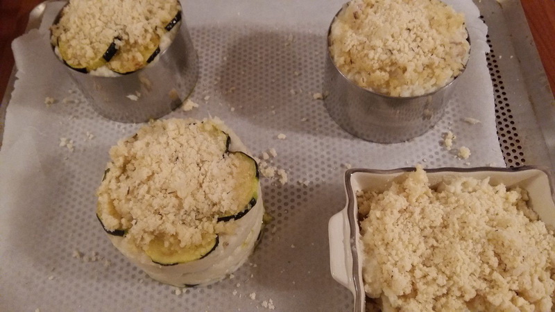 - Tapisser une seconde plaque du four de papier cuisson et y poser un emporte pièce de 8,5 cm de diamètre. En tapisser ensuite le fond de rondelles de courgette. Ajouter de la brandade, puis alterner ainsi les couches en terminant par un couche de crumble.