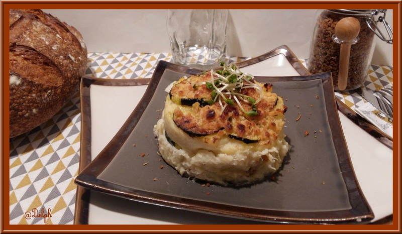 - Tapisser une seconde plaque du four de papier cuisson et y poser un emporte pièce de 8,5 cm de diamètre. En tapisser ensuite le fond de rondelles de courgette. Ajouter de la brandade, puis alterner ainsi les couches en terminant par un couche de crumble.