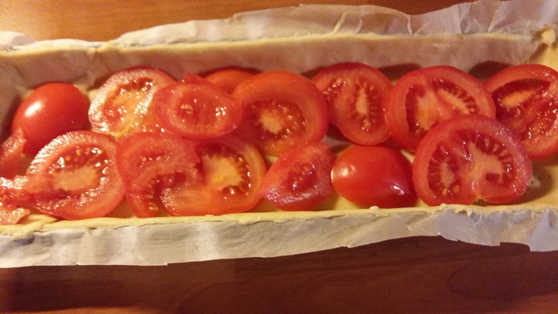 - Couper les tomates en rondelles et les disposer sur la pâte.