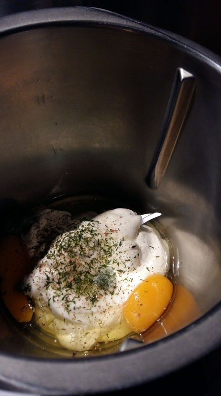- Mettre dans le bol du Thermomix les œufs et la crème le Sel et le poivre puis l’aneth, mixer 40sec/Vit4.