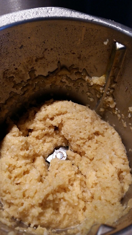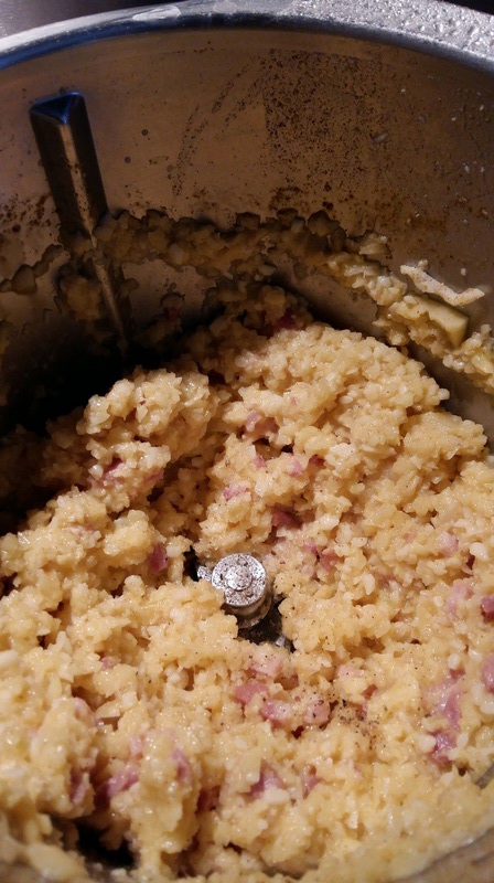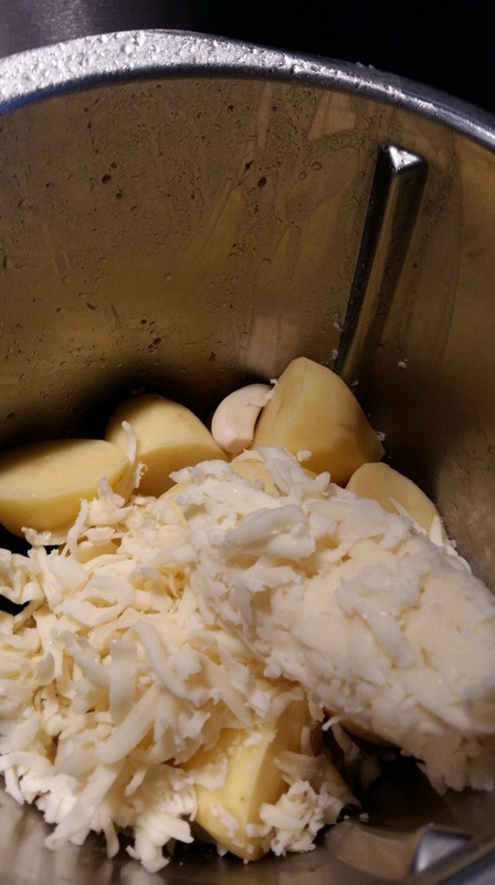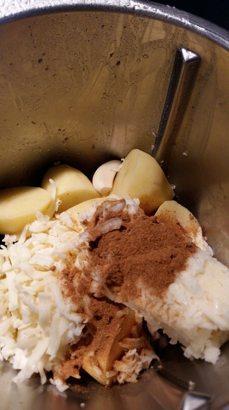 - Éplucher et laver les pommes de terre les couper en deux, ajouter l’oignon coupé en deux, l’ail. Les mettre dans le bol avec les œufs, le sel, le poivre, la mozzarella râpée et l’épice. Mixer 10 sec/Vit 5.